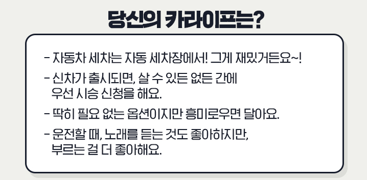 내 성향에 잘 어울리는 차량이 무엇인지 무료 테스트입니다. MBTI 등 다양한 테스트가 인기인데요. 내 성향에 맞는 차량 추천 테스트가 나왔습니다. 약 15초밖에 걸리지 않으니 한번씩 재미삼아