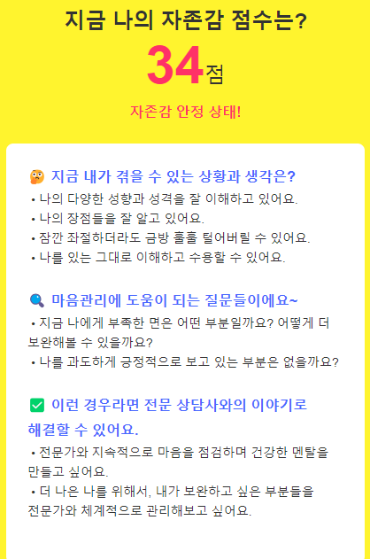 오늘은 자존감 테스트 바로가기 입니다^^. 지금 바로 나의 자존감 정도를 알아보세요!